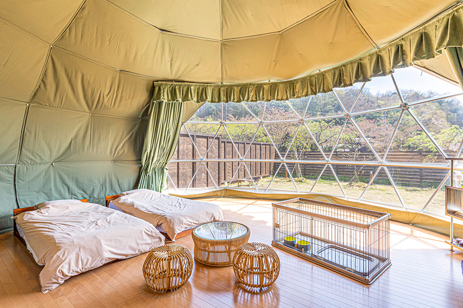 直径7mの大型ドーム型テント。テント内にはシングルベッドを2台配置しており、マットレスを使用すれば最大5名まで宿泊可能です。ペットも同伴可となっており、専用のドッグラン、専用の食事スペース、天然温泉も完備しておりますので、ゆったりとプライベート空間をご堪能下さい。