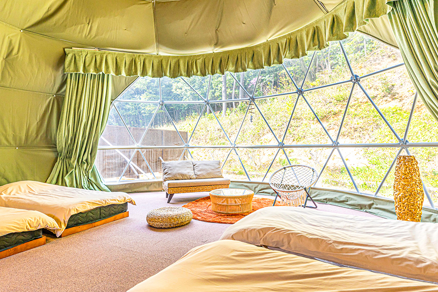 宿泊するのは、4ベッドを備えたファミリー向けドームテント。